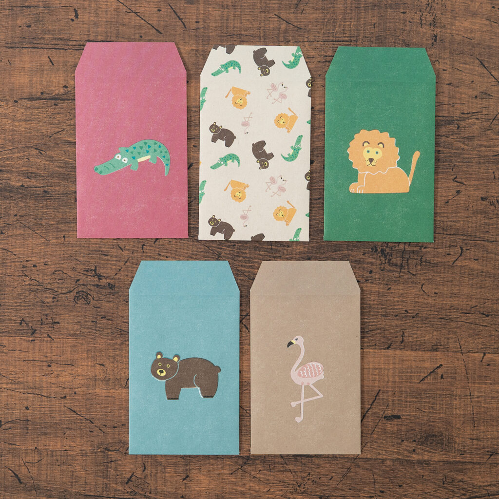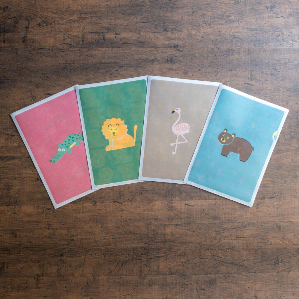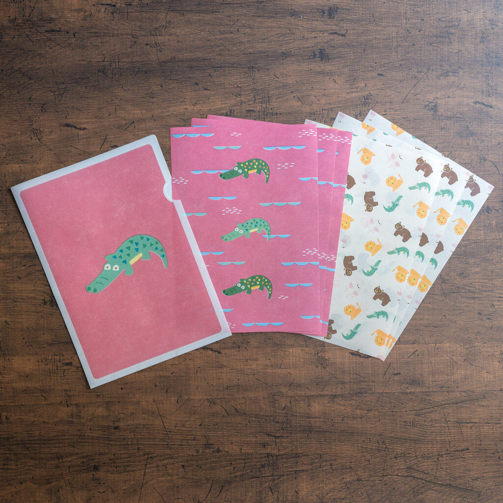 クリアファイルの中にはそれぞれ表紙と同じ動物がモチーフのデザインペーパーと、