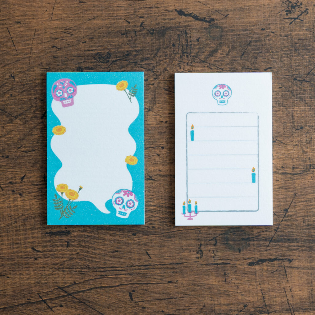 メキシコの伝統行事”死者の日”に欠かせない、カラフルなガイコツ”カラベラ”とマリーゴールドのイラストを使用しました。
